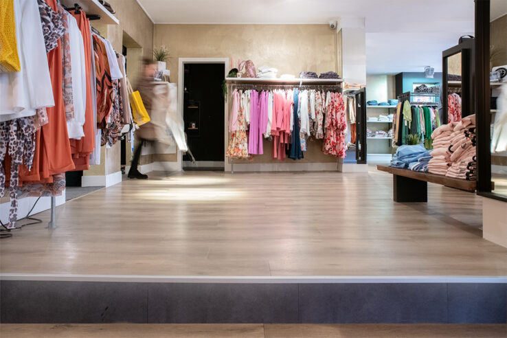 De natuurlijke kleuren van de eikenhouten vloer sluiten aan bij de industriële meubelen en landelijke elementen in de winkel van Dejacque. De kleurrijke kleding, schoenen en accessoires krijgen zo contrast en worden zo extra uitgelicht.