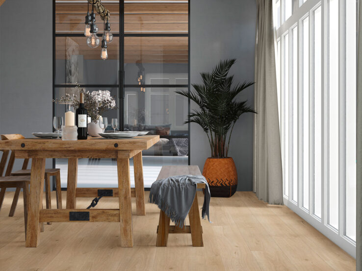 De Hongaarse punt 7230 vermengt licht eikenhout met een kenmerkend hoekig punt patroon, pe...