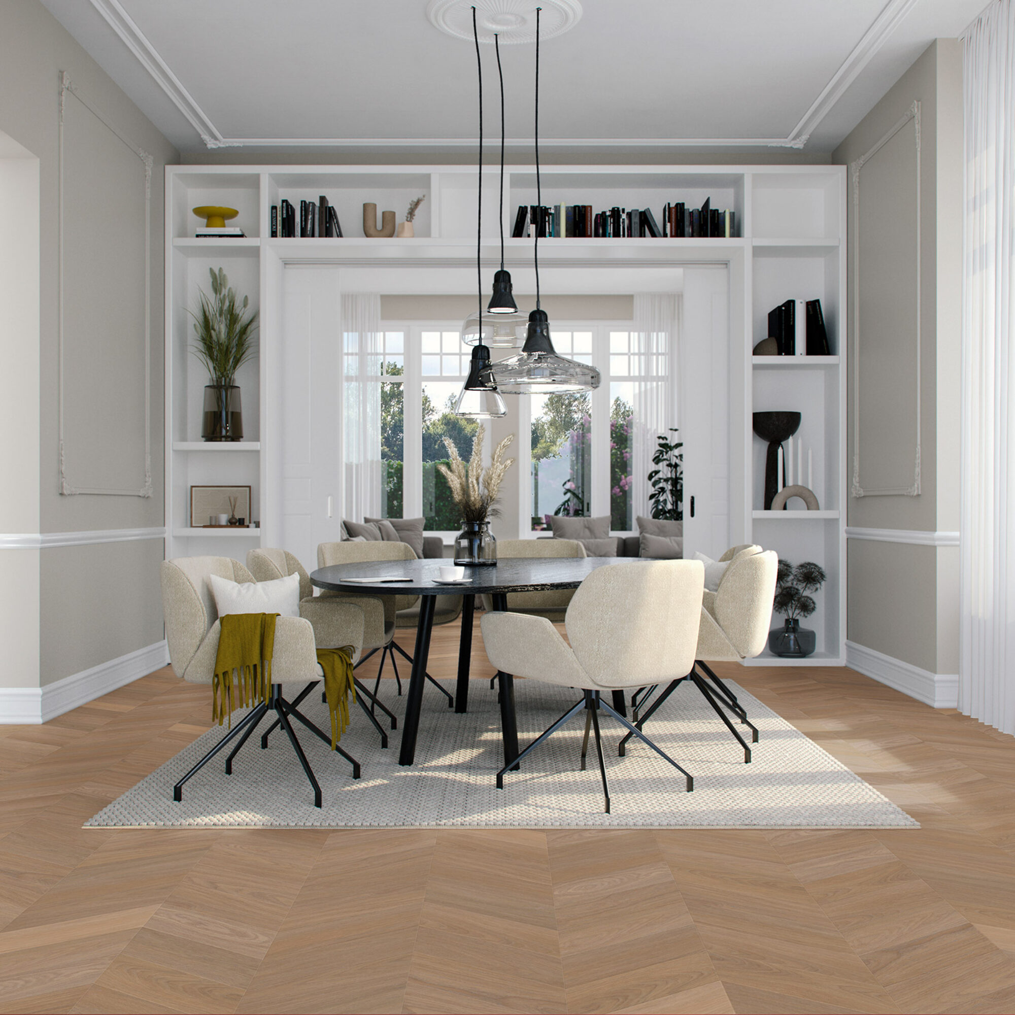 De Bologna serie bestaat uit zes kleuren, geïnspireerd door de charmante stad Bologna, waar warme tinten en natuurlijke materialen perfect samensmelten. Deze vloeren hebben een woud touch embossing, waardoor de natuurlijke structuur van het eikenhout prachtig tot leven komt, en voel je de textuur echt. Wat deze serie echt uniek maakt, is de kleurschakering: elke plank heeft subtiele variaties in kleur, wat zorgt voor een levendige en dynamische uitstraling in elke ruimte. Deze serie is volledig verkrijgbaar in lijm, click, walvisgraat en Hongaarse punt.