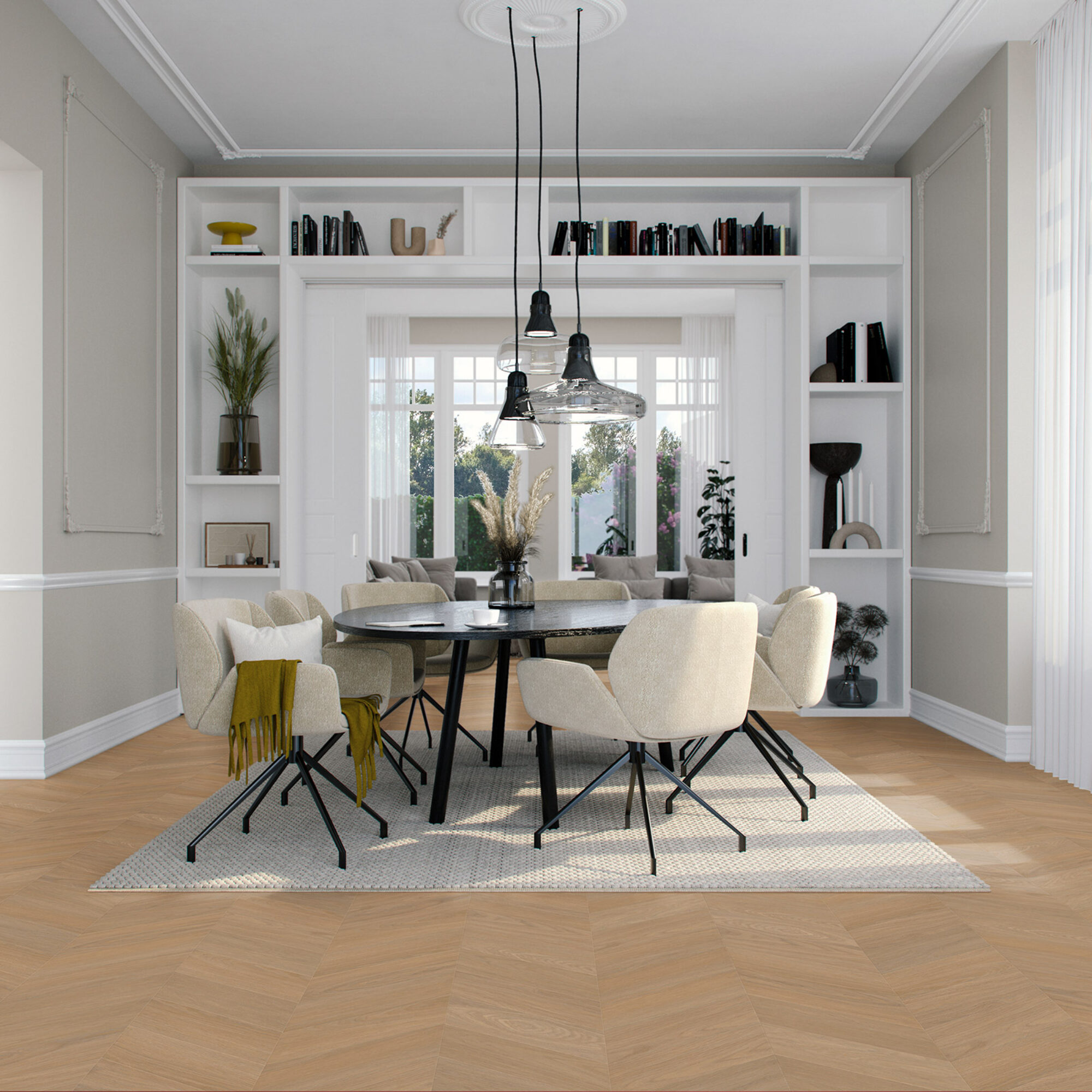 De Bologna serie bestaat uit zes kleuren, geïnspireerd door de charmante stad Bologna, waar warme tinten en natuurlijke materialen perfect samensmelten. Deze vloeren hebben een woud touch embossing, waardoor de natuurlijke structuur van het eikenhout prachtig tot leven komt, en voel je de textuur echt. Wat deze serie echt uniek maakt, is de kleurschakering: elke plank heeft subtiele variaties in kleur, wat zorgt voor een levendige en dynamische uitstraling in elke ruimte. Deze serie is volledig verkrijgbaar in lijm, click, walvisgraat en Hongaarse punt.